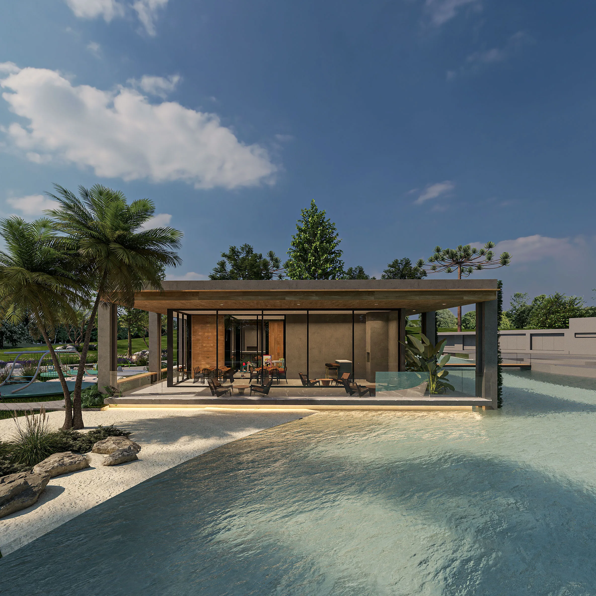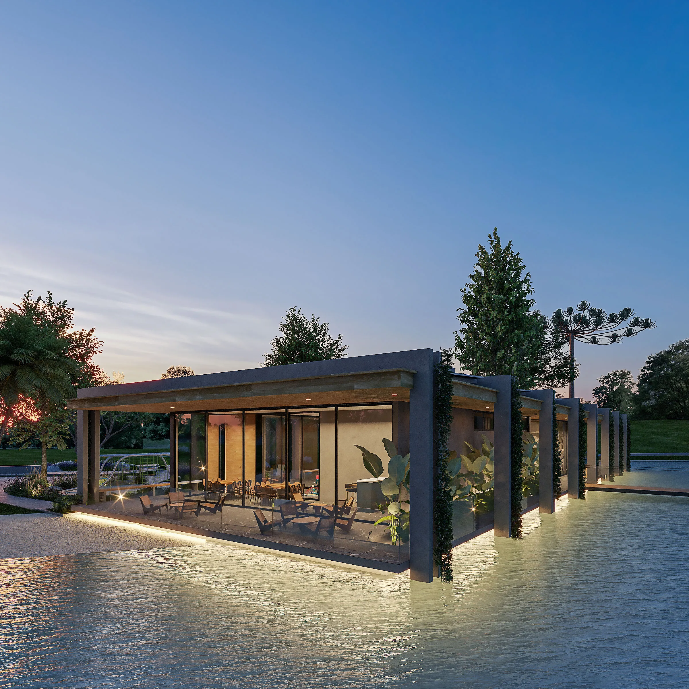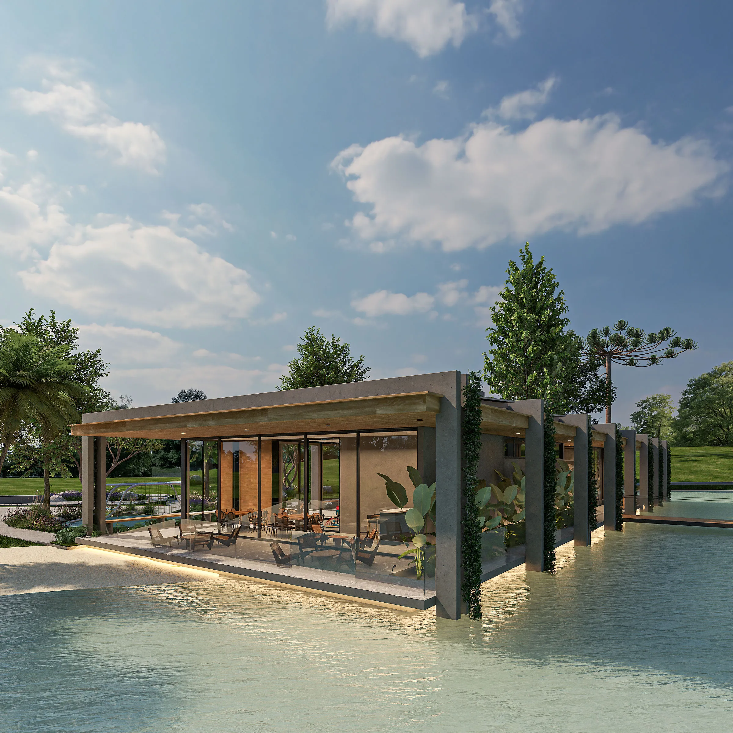 Projetado para eventos e encontros, o salão flutua sobre o espelho d’água, em um gesto de integração total com o entorno e valorização do convívio.