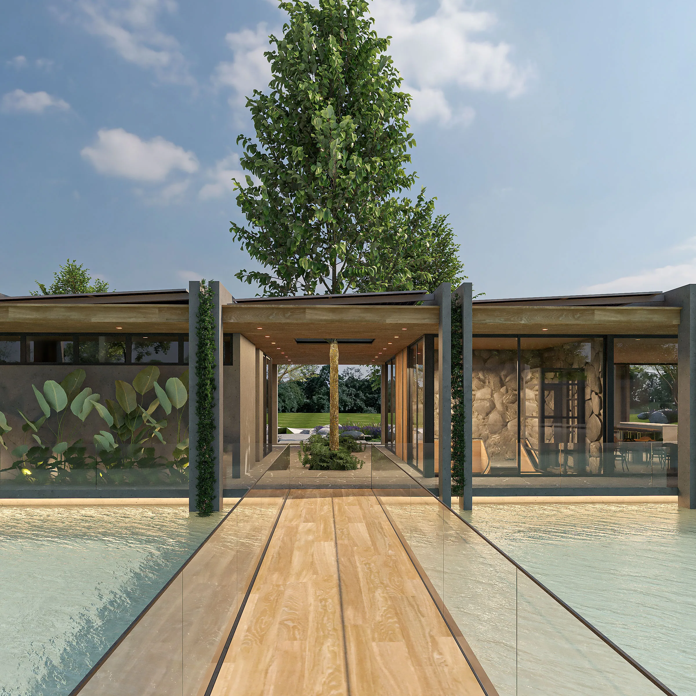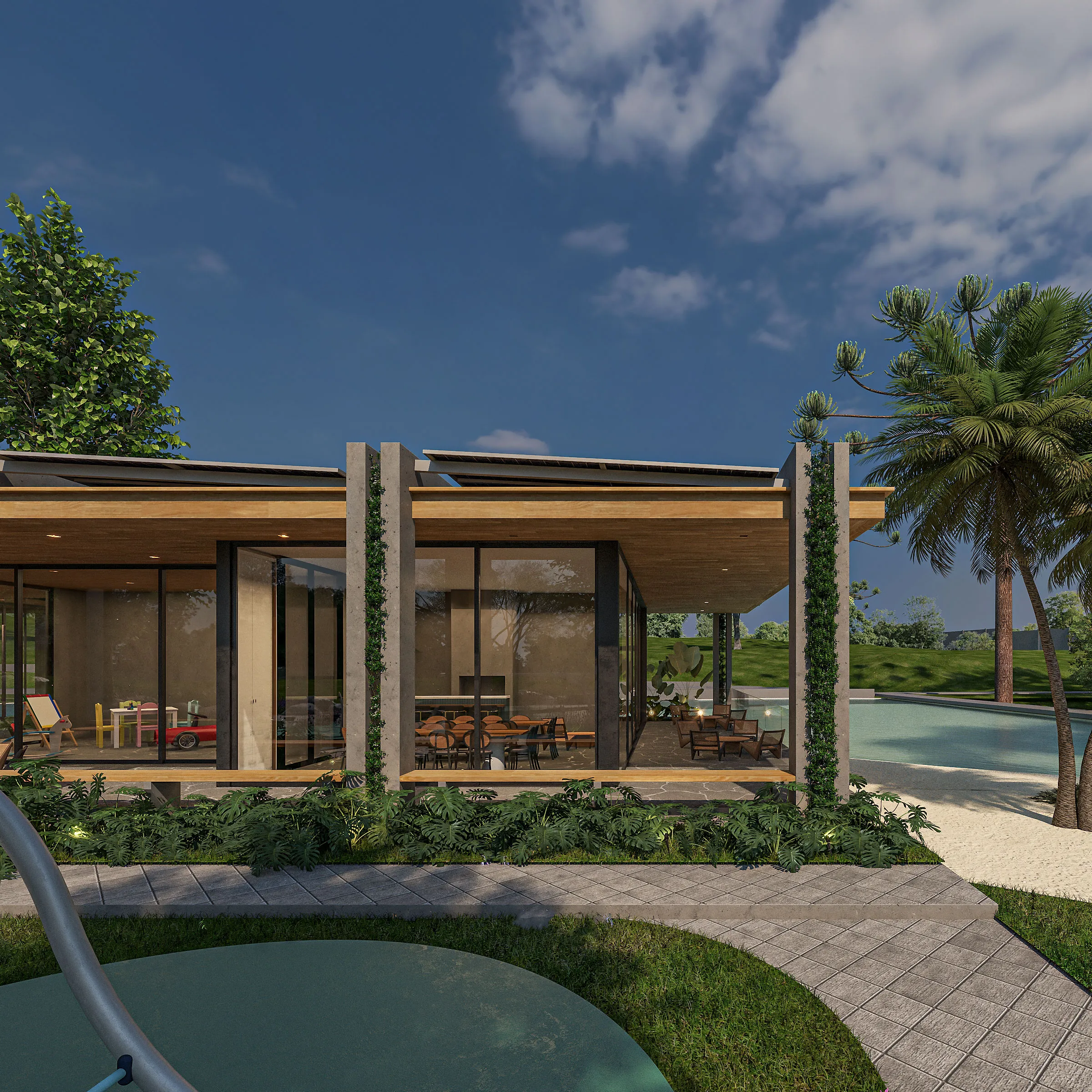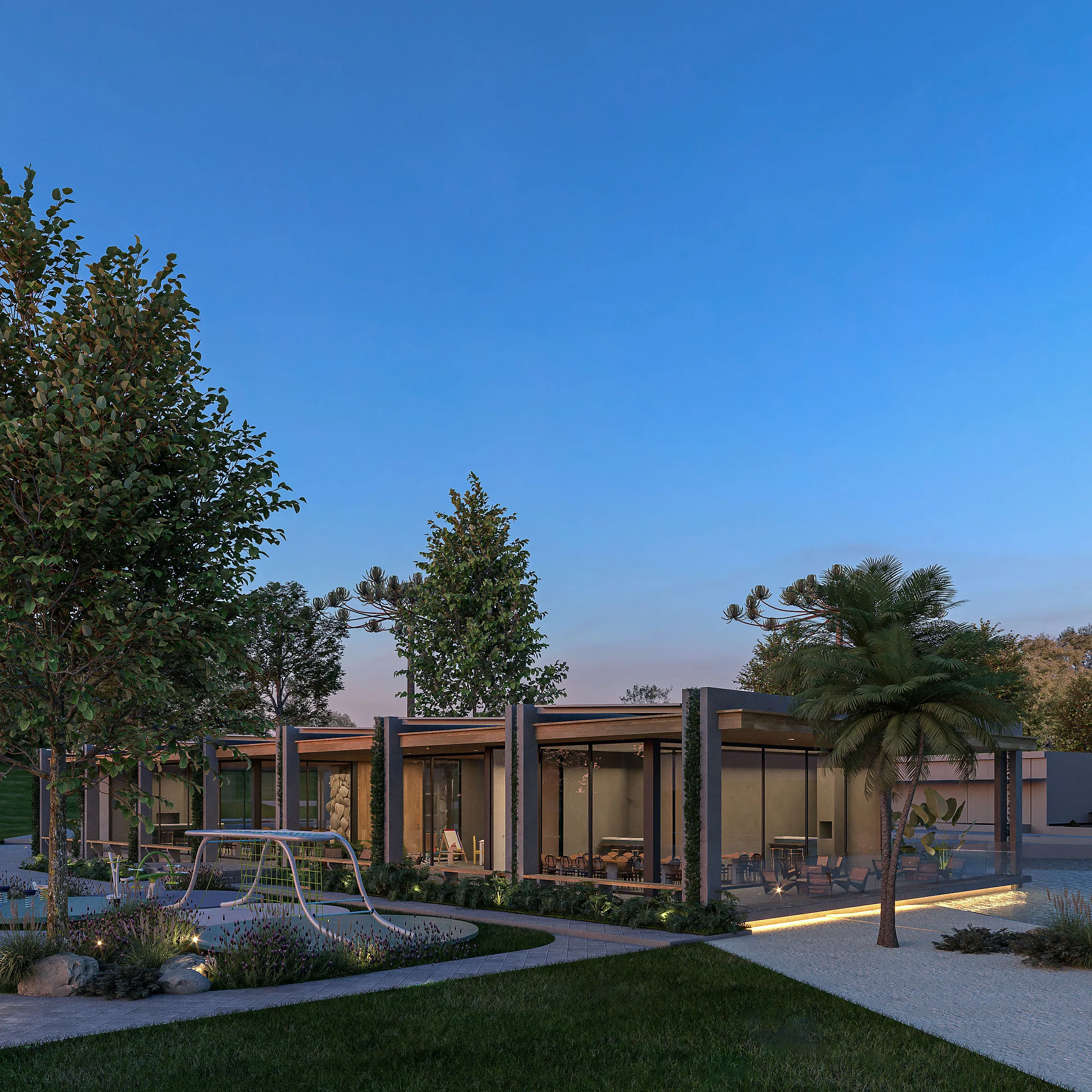 Projetado para eventos e encontros, o salão flutua sobre o espelho d’água, em um gesto de integração total com o entorno e valorização do convívio.