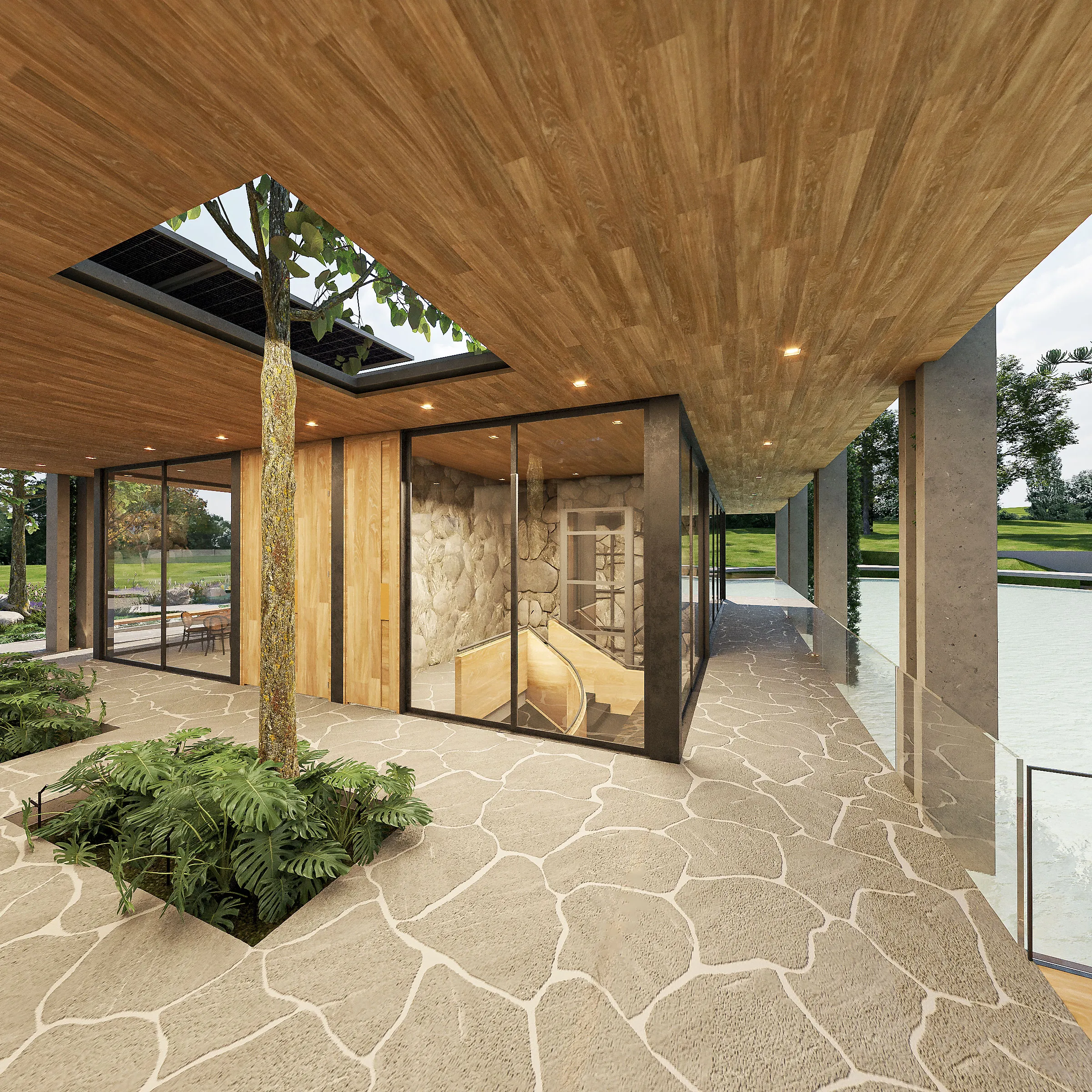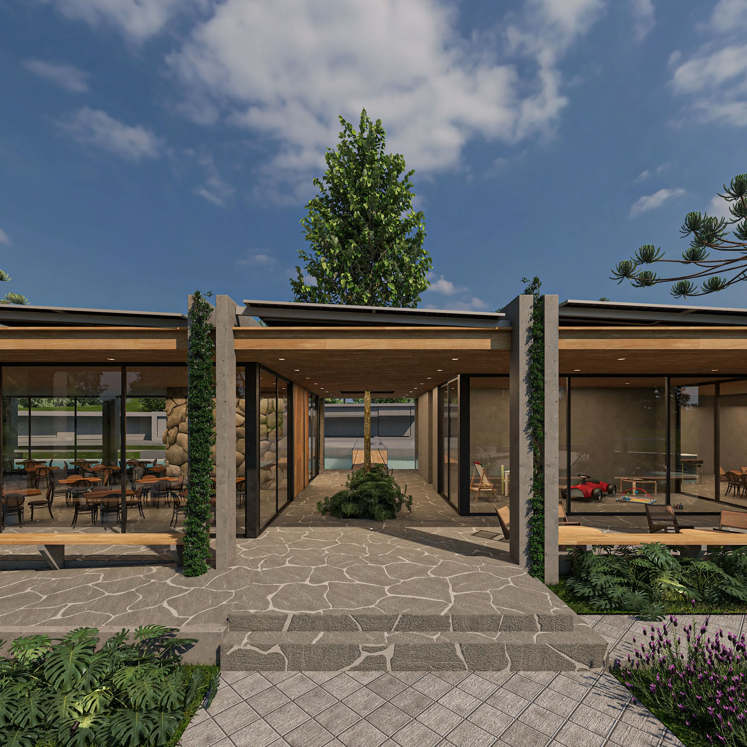 Com formas esculturais em madeira engenheirada, o pórtico acolhe quem chega com imponência sutil e conexão com a paisagem nativa.